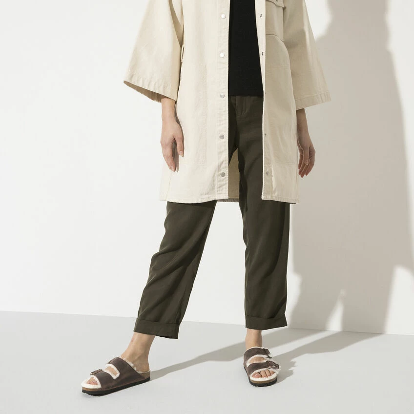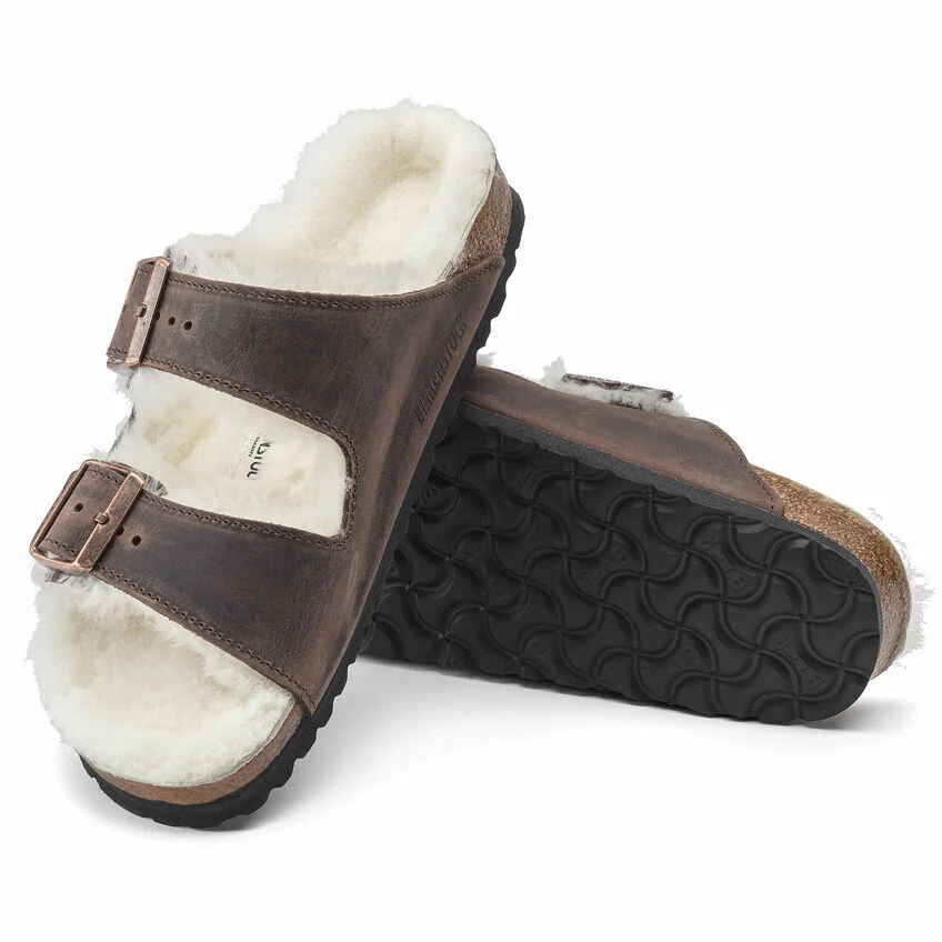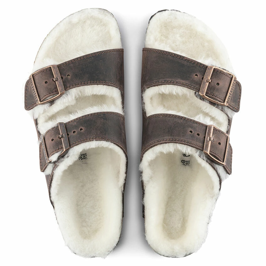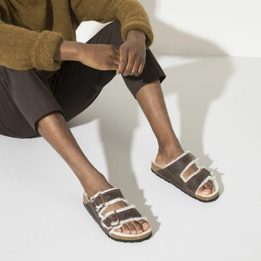 The legendary two-strap design from BIRKENSTOCK – the Arizona. Iconic style with the signature comfort of the BIRKENSTOCK footbed. Now available in an extra cozy version thanks to a soft, bright genuine shearling lining on the anatomically formed cork-latex footbed and straps. The upper is made from extra thick, oiled nubuck leather with an open-selvage finish.