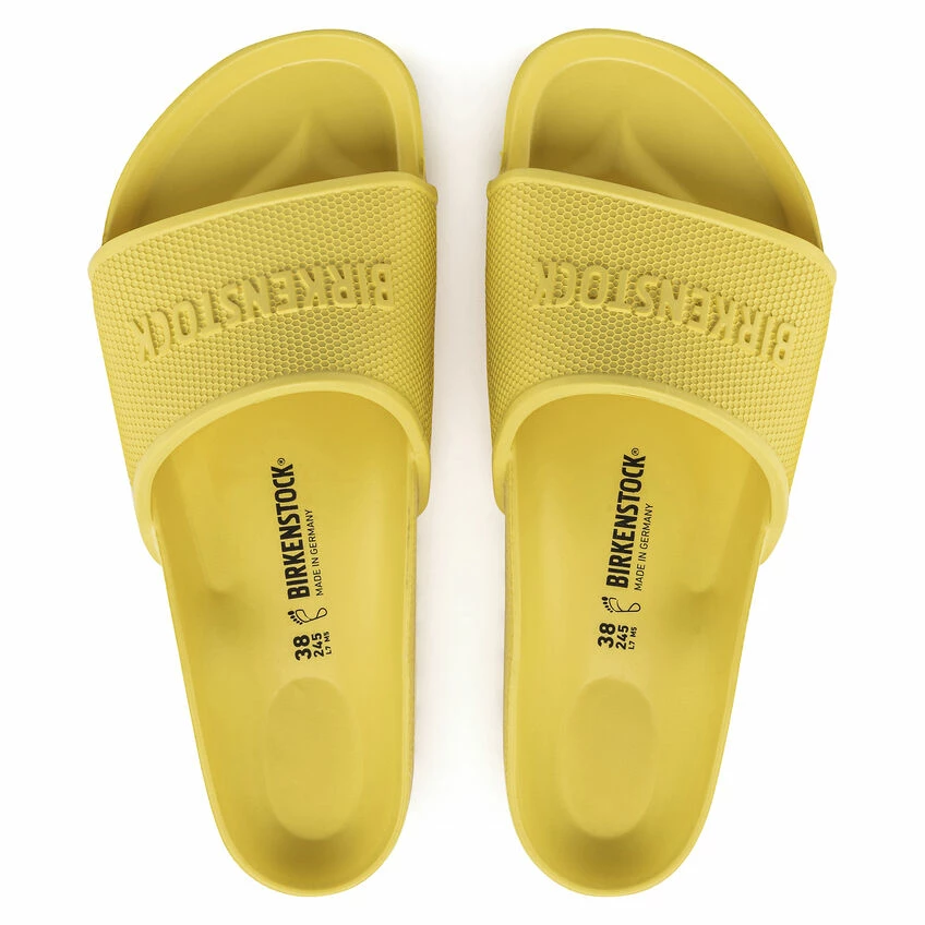 The BIRKENSTOCK Barbados is a sporty slide design with an embossed strap and logo lettering. Modeled on the cork sandal, this sandal is made from one piece of light, flexible and waterproof molded EVA.