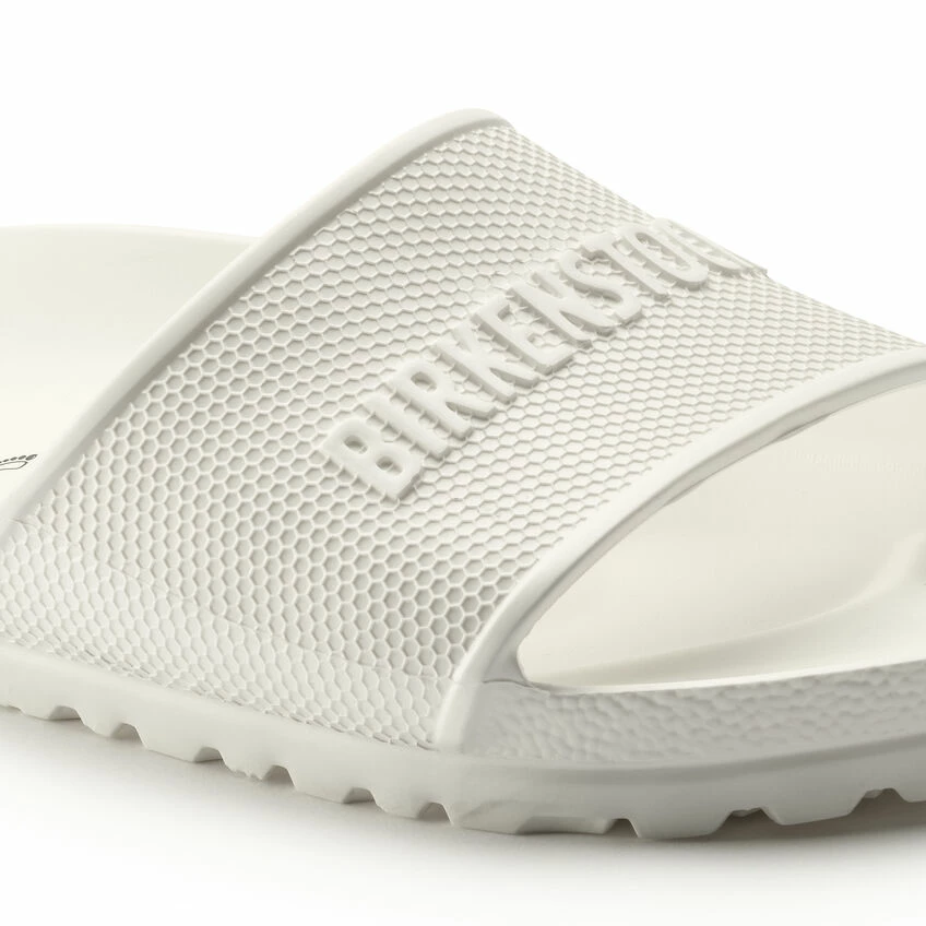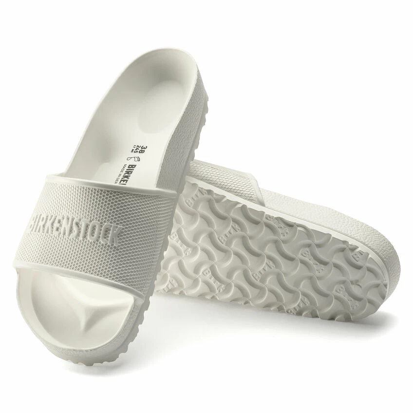 The BIRKENSTOCK Barbados is a sporty slide design with an embossed upper and logo lettering. Modeled on the cork sandal, this sandal is made from one piece of light, flexible and waterproof molded EVA.