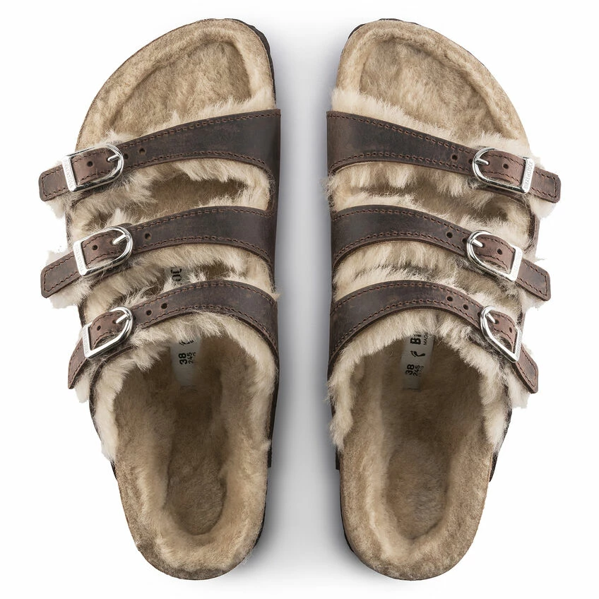 The Florida Fresh – strappy style meets signature comfort. This BIRKENSTOCK slide features three slender, adjustable straps and a contoured cork/latex footbed that forms to the shape of your foot. This version is lined with especially cozy shearling. With D-buckles and a color-coordinated footbed to round off the overall look. The upper is made from extra thick, oiled nubuck leather.