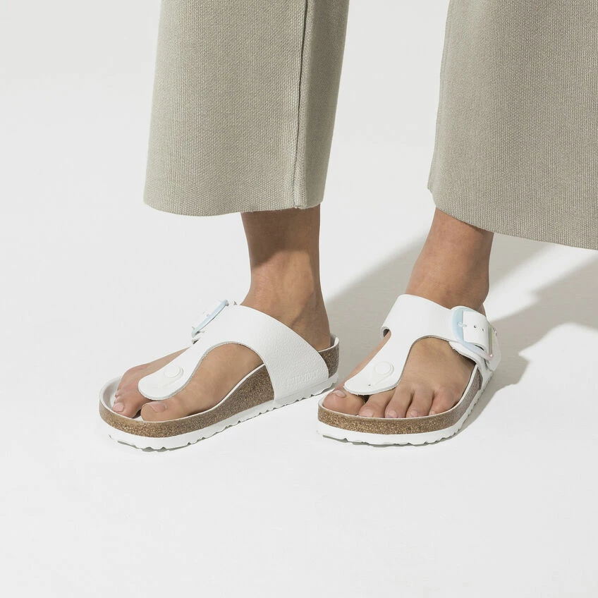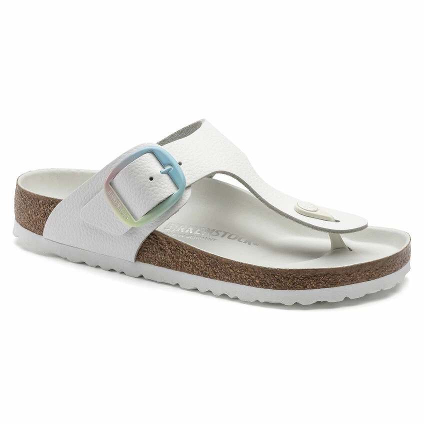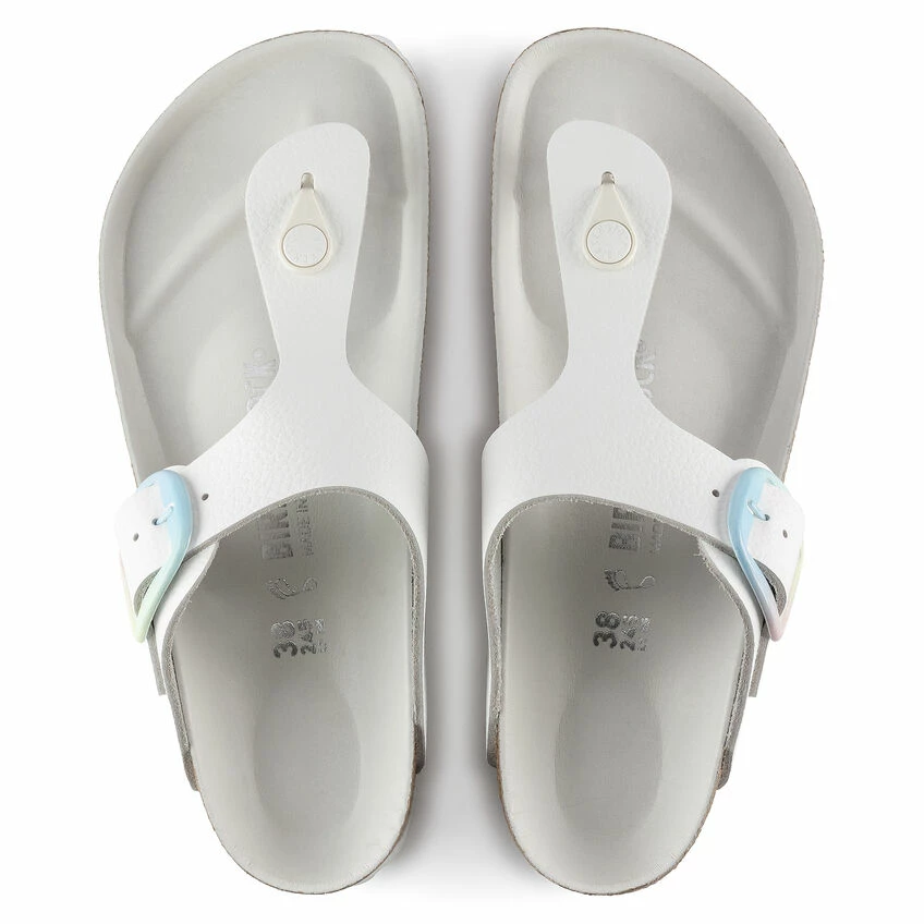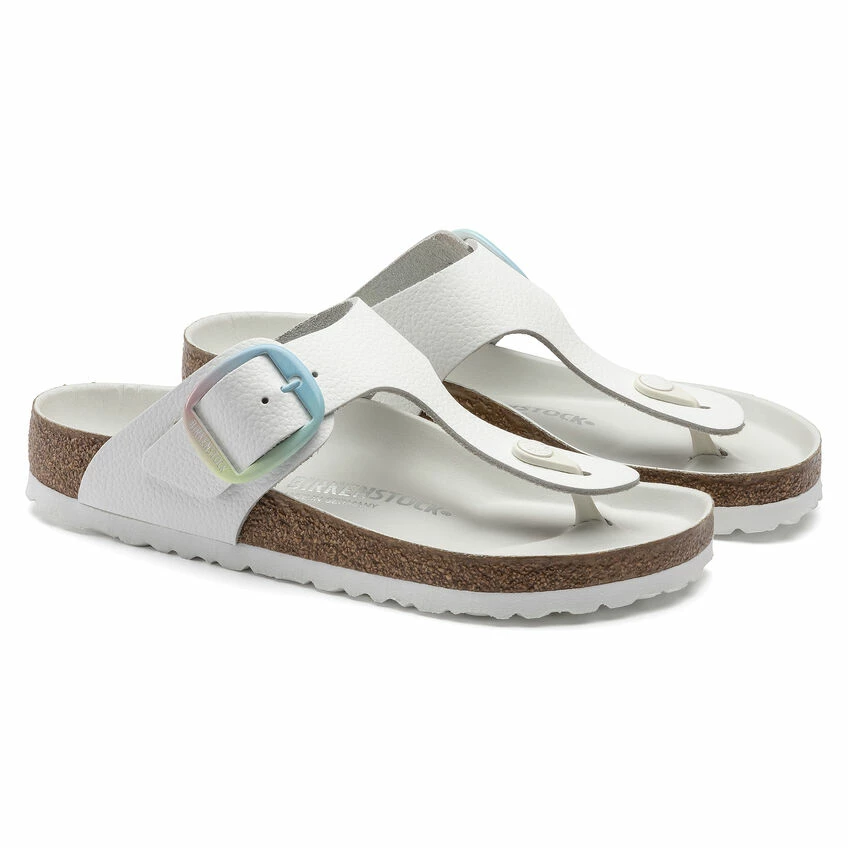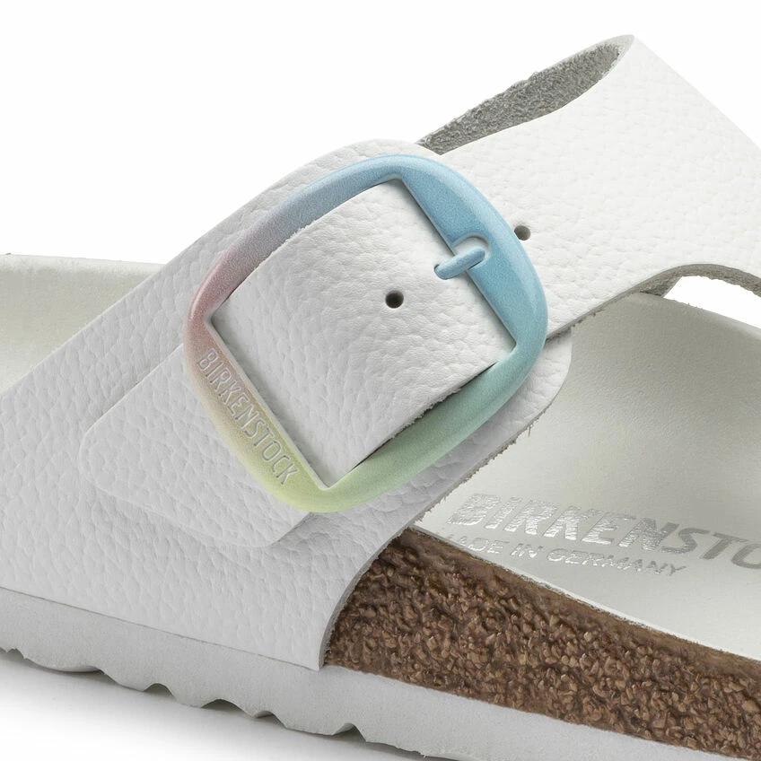 The Gizeh is a modern thong sandal from BIRKENSTOCK. Signature comfort with a refined, minimalist style, featuring the support of the iconic footbed. This version features our popular Big Buckle with an ombre effect โ a colorful pastel accent on this otherwise understated sandal. The color-coordinated semi-exquisite footbed is fully lined with soft piumato leather. The upper is made from high-quality aniline leather.