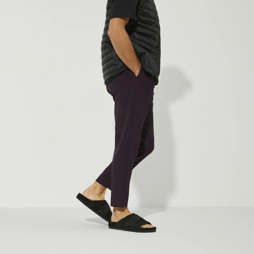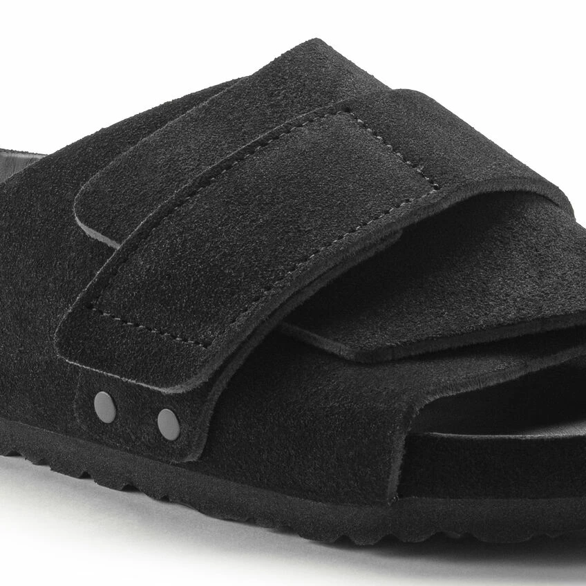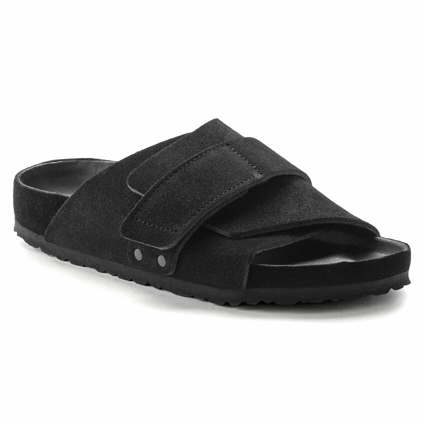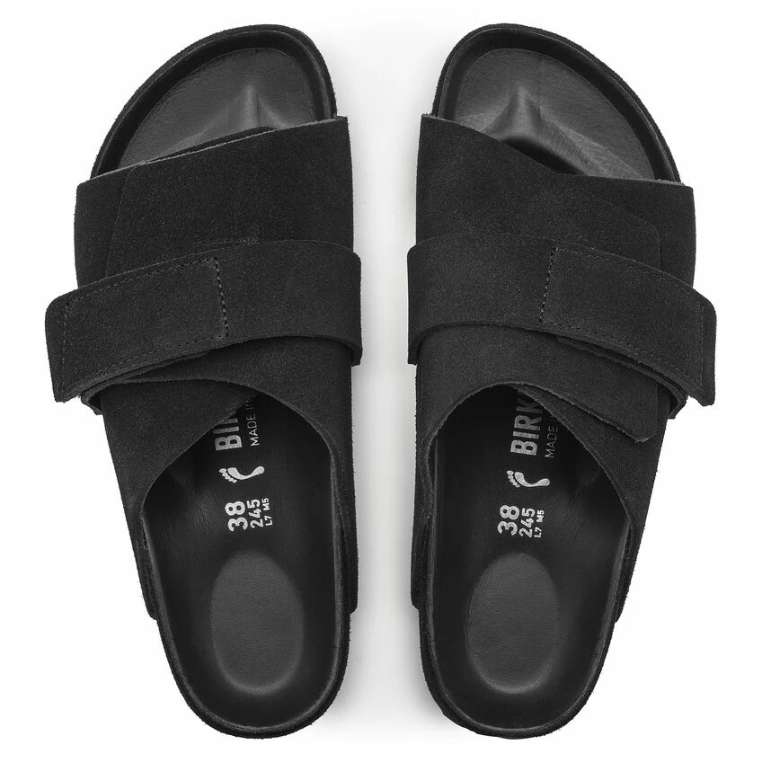 The casual BIRKENSTOCK Kyoto stands out with its envelope design and individually adjustable hook and loop closure. Giving this casually stylish sandal a slipper like fit and feel. This exquisite version features a footbed fully lined with luxuriously smooth, color coordinating leather. The upper is made from especially soft suede.