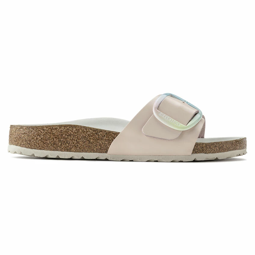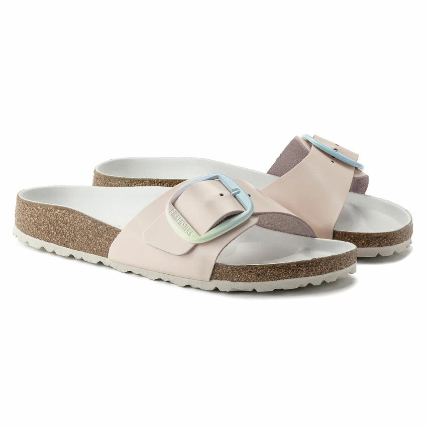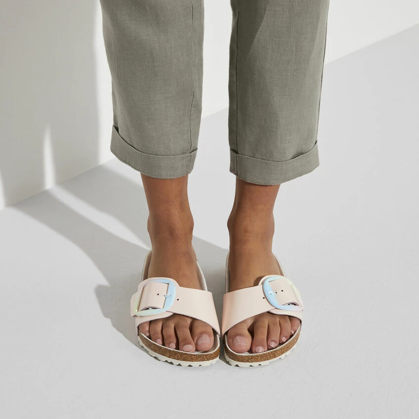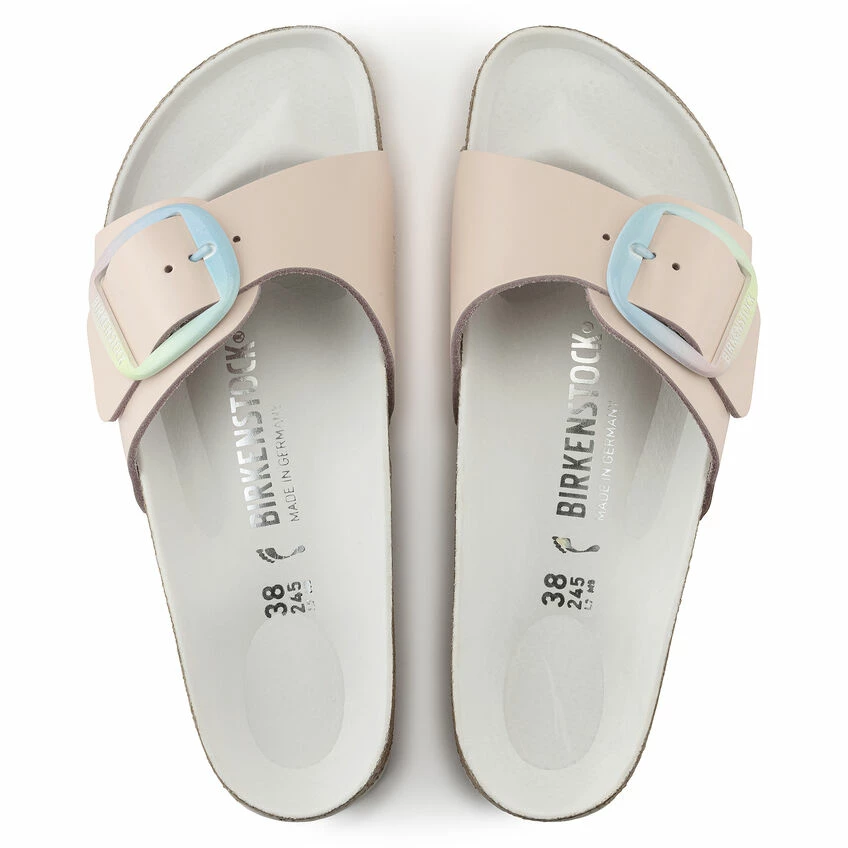 The original BIRKENSTOCK Sandal. A strap, a buckle, and a contoured cork footbed are masterfully combined to create the Madrid. This version features our popular Big Buckle with an ombre effect β a colorful pastel accent on this otherwise understated sandal. The color-coordinated semi-exquisite footbed is fully lined with soft piumato leather. The upper is made from high-quality aniline leather.