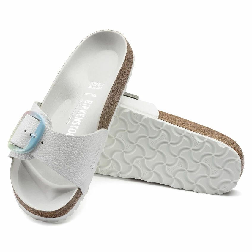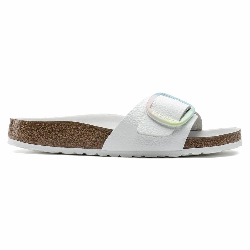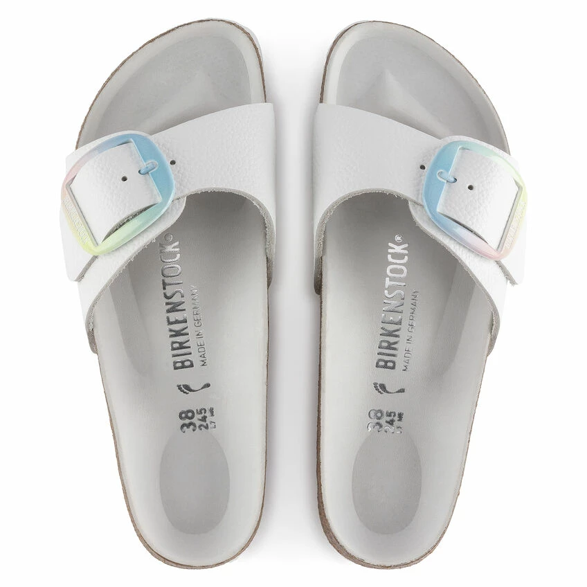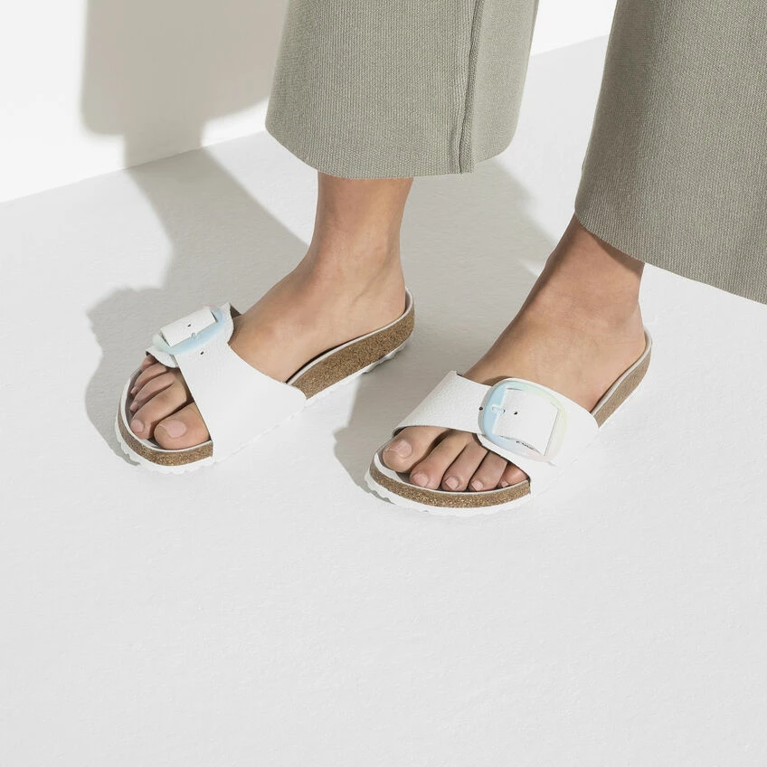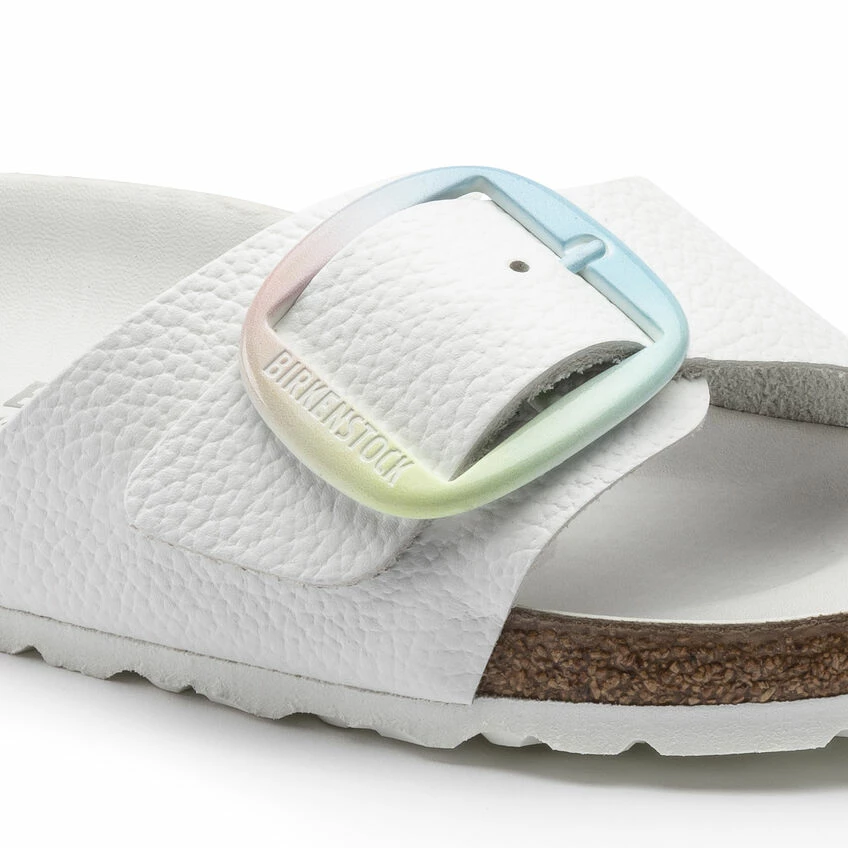 The original BIRKENSTOCK Sandal. A strap, a buckle, and a contoured cork footbed are masterfully combined to create the Madrid. This version features our popular Big Buckle with an ombre effect – a colorful pastel accent on this otherwise understated sandal. The color-coordinated semi-exquisite footbed is fully lined with soft piumato leather. The upper is made from high-quality aniline leather.