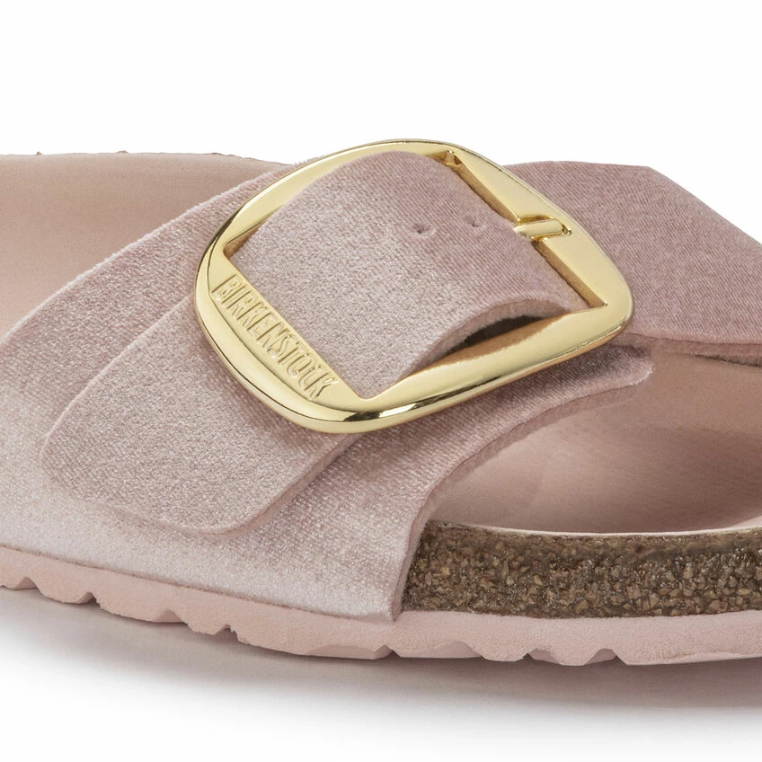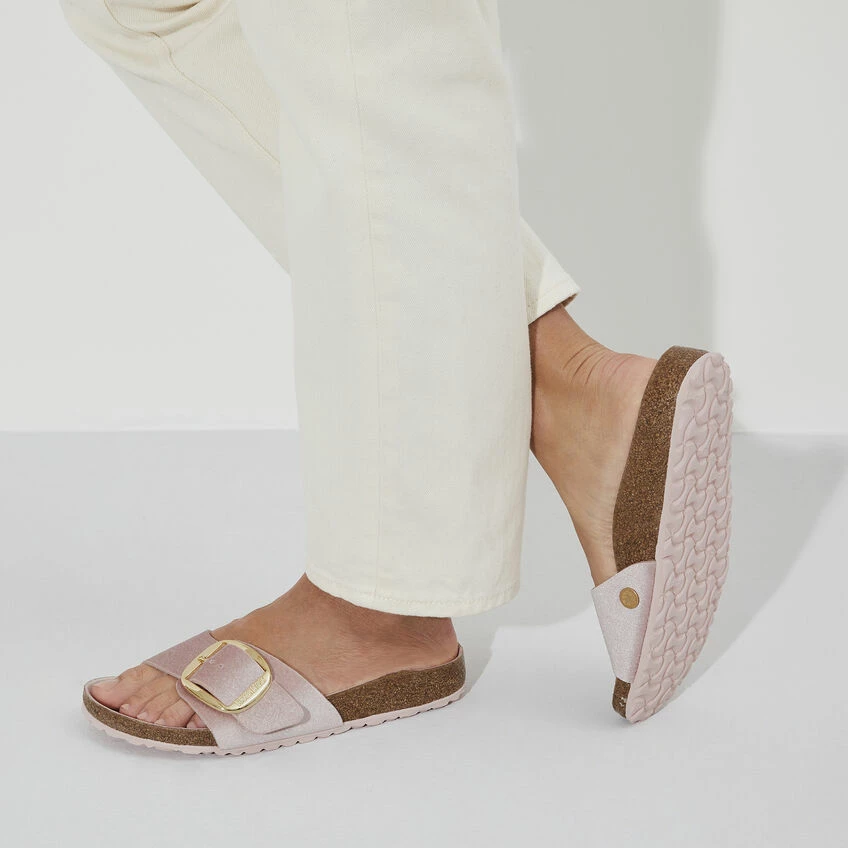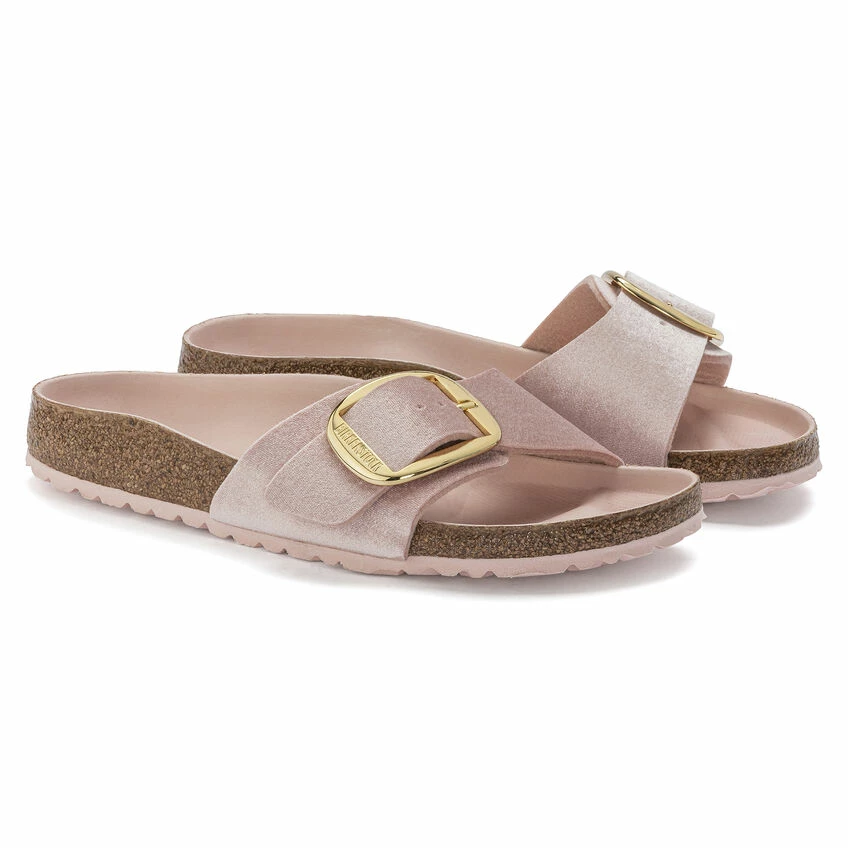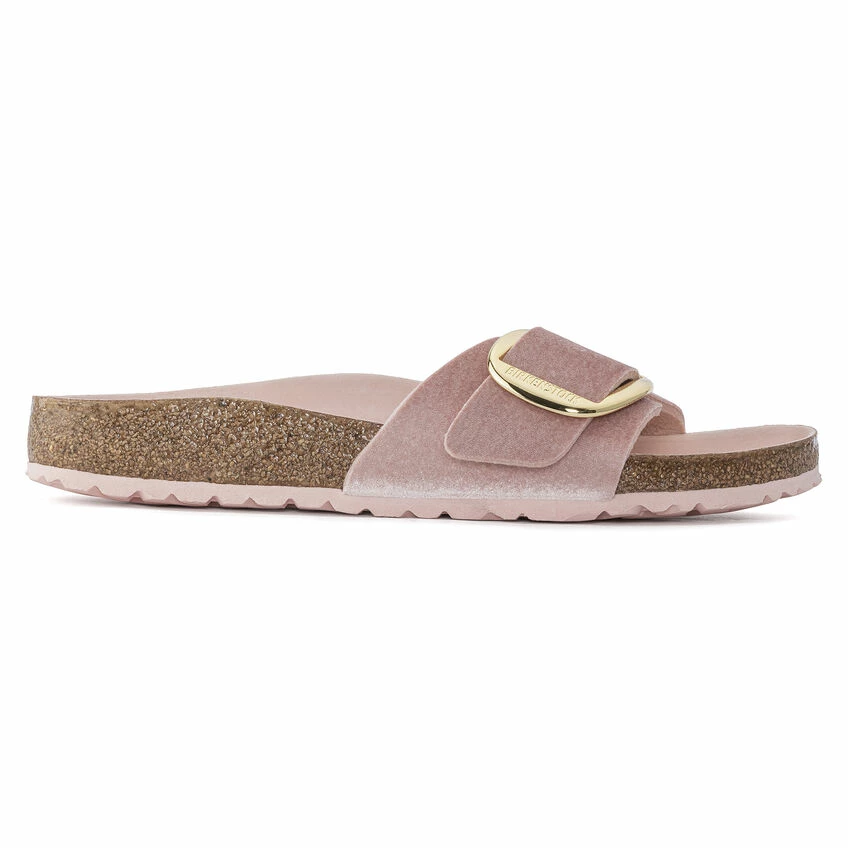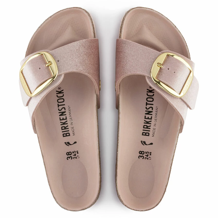 After party ready. A smooth, velvety upper gives the Madrid a subtle shimmer for the season. The soft pink style pairs perfectly with a shiny, oversized buckle and tonal, smooth leather footbed for a luxe look inside and out. Complete with go-all-night comfort from the original contoured BIRKENSTOCK footbed.