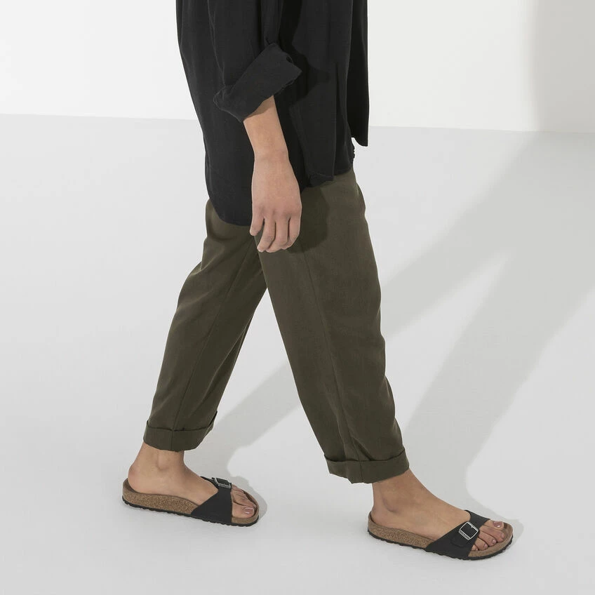 A strap, a buckle and a contoured cork footbed are masterfully combined to create the original Birkenstock sandal – the Madrid. An iconic slide with a classic buckle accent now available in a vegan material. The upper is made from the skin-friendly, hard-wearing synthetic material Birkibuc.