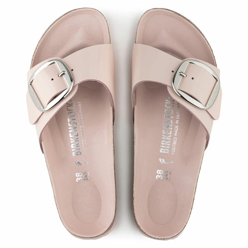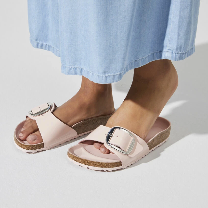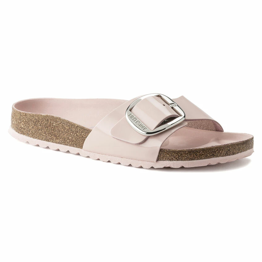 The original BIRKENSTOCK Sandal. A strap, a buckle, and a contoured cork footbed are masterfully combined to create the Madrid. An iconic slide with an amplified buckle accent. The semi-exquisite footbed is fully lined with soft piumato leather, making it exceptionally comfortable. The upper is made from high-quality natural leather with a high shine finish.