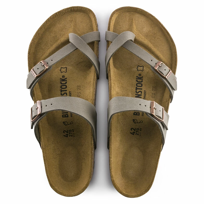 The BIRKENSTOCK Mayari thong sandal is a jaunty model with a toe loop. The impressive combination of design and wearability will see fashion-conscious men and women through the day with elegance and comfort. The upper is made from the skin-friendly, hard-wearing synthetic material Birko-Flor® in a sophisticated nubuck look which boasts a texture and color that could almost be mistaken for real leather.