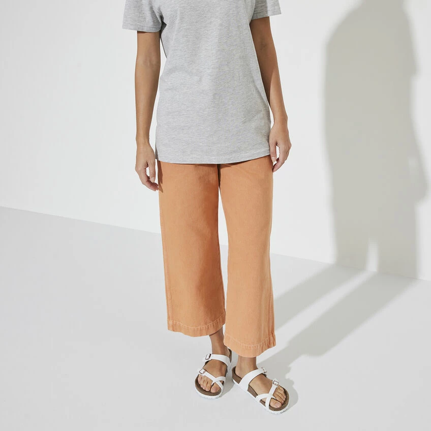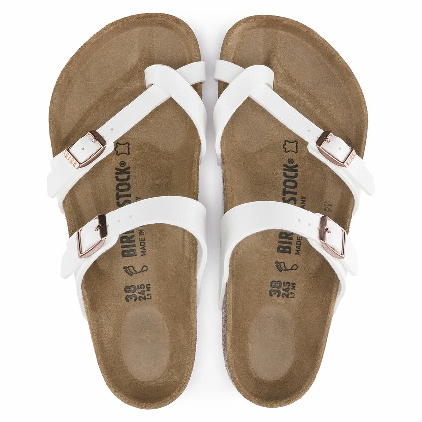 The Mayari from BIRKENSTOCK – an elegantly comfortable sandal with adjustable, crisscrossing straps that form a single loop around the toe. Classic support and adjustability, designed beautifully. Shown in white Birko-Florยฎ with tone on tone outsole and copper tone buckles.