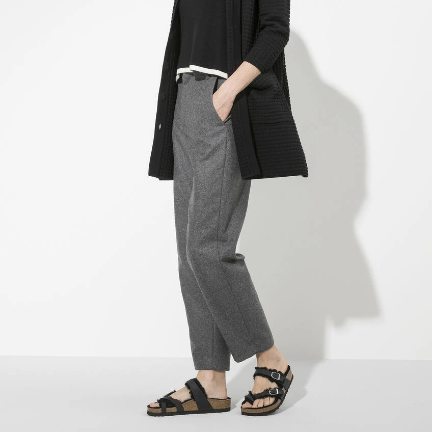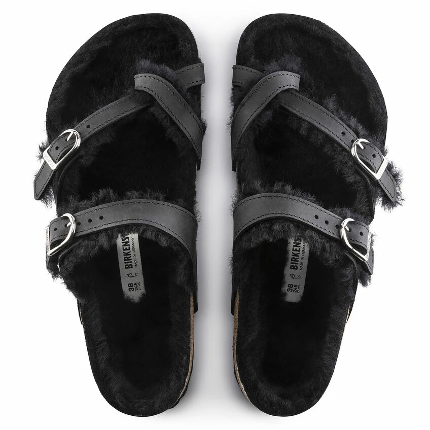 The Mayari from BIRKENSTOCK – an elegantly comfortable sandal with adjustable, crisscrossing straps that form a single loop around the toe. Classic support and adjustability, designed beautifully. Here, the classic model comes in a particularly cozy version with shearling lining. The perfect shoe for cozy winter evenings! And featuring new D-shaped buckles. The upper is made from extra thick, oiled nubuck leather.