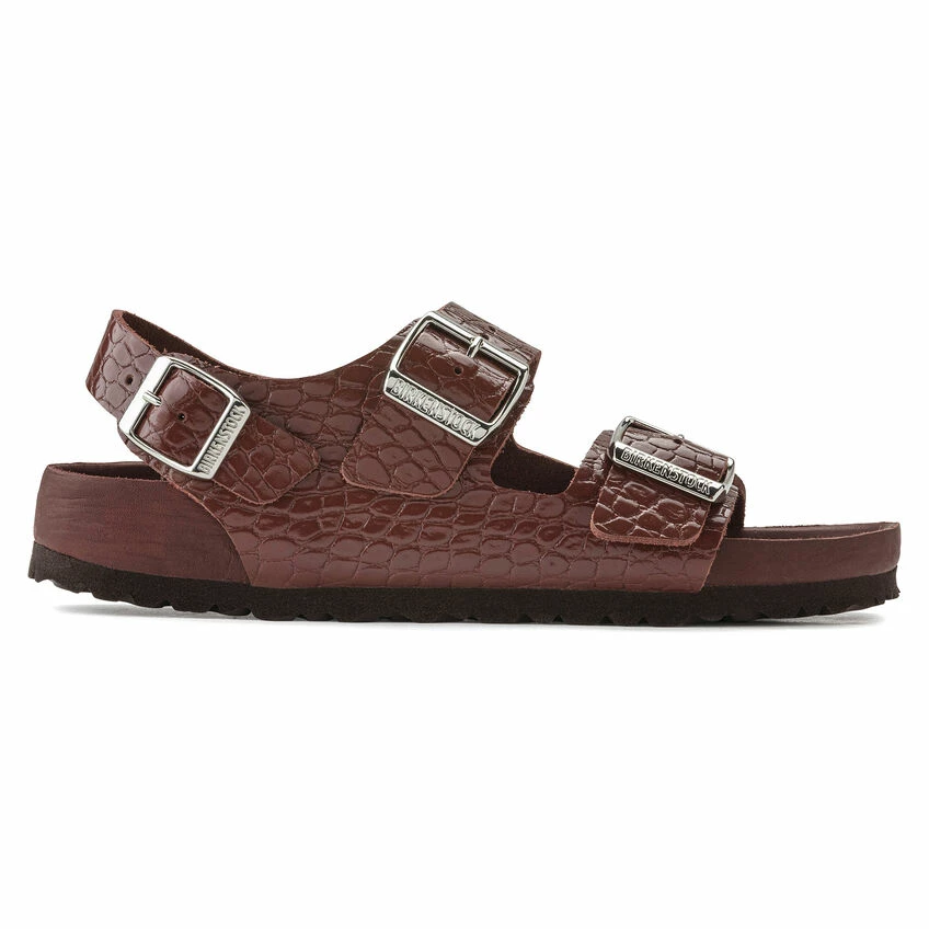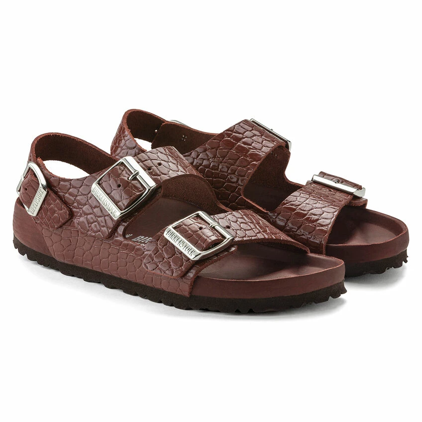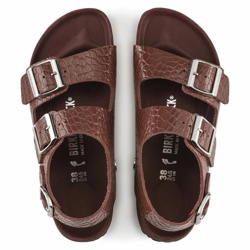 The BIRKENSTOCK Milano now features a reptile leather look and feel and a compact design with an ankle strap. The metal pin buckles are individually adjustable with color-coordinated detailing. The exquisite footbed is fully lined with soft piumato leather, making it exceptionally comfortable. The upper is made from embossed natural leather.