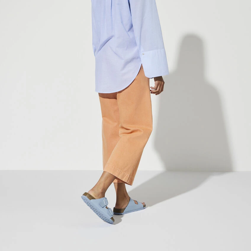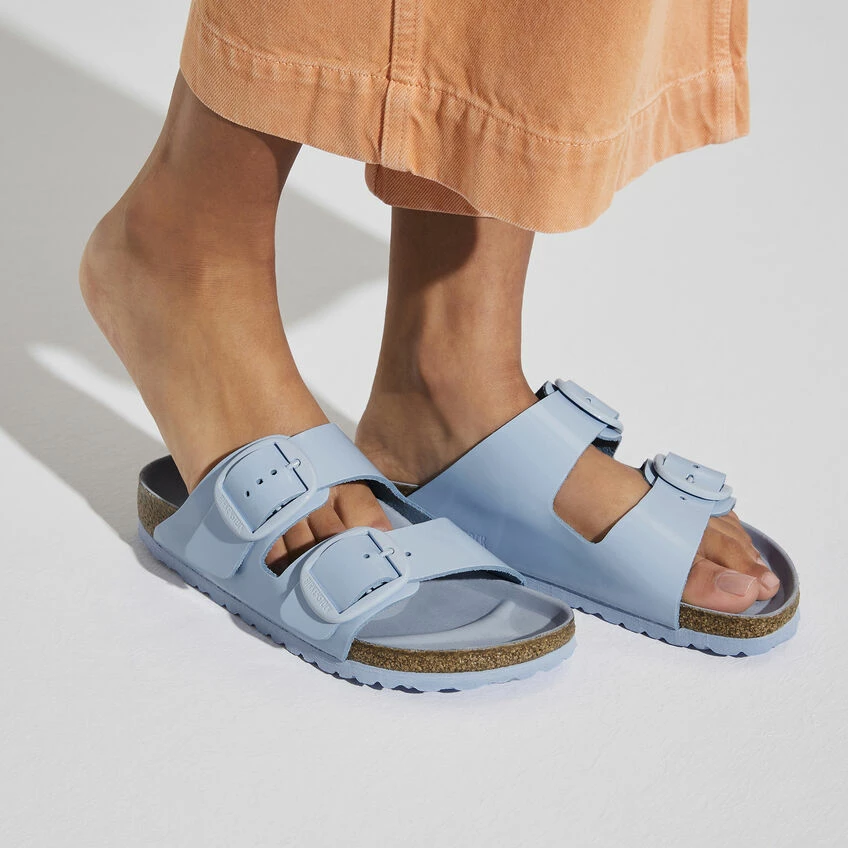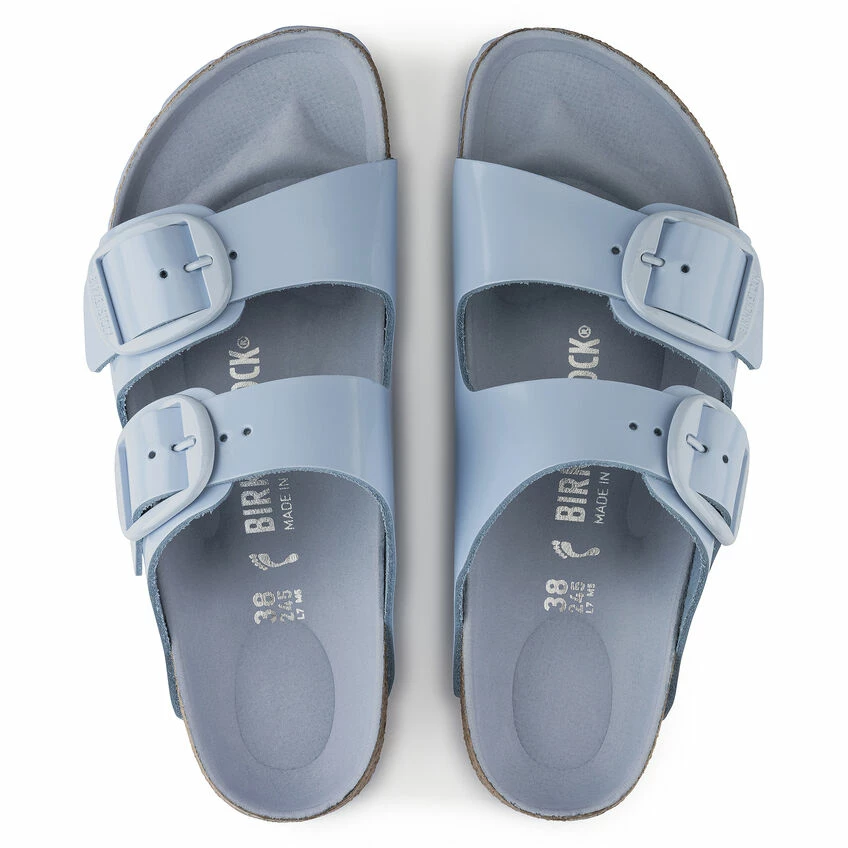 The legendary two-strap design from BIRKENSTOCK with amplified buckle accent – the Arizona Big Buckle. The Big Buckle version features a large, elegant buckle creating a bold yet minimalist design. The semi-exquisite footbed is fully lined with soft piumato leather, making it exceptionally comfortable. The upper is made from high-quality natural leather with a high shine finish.