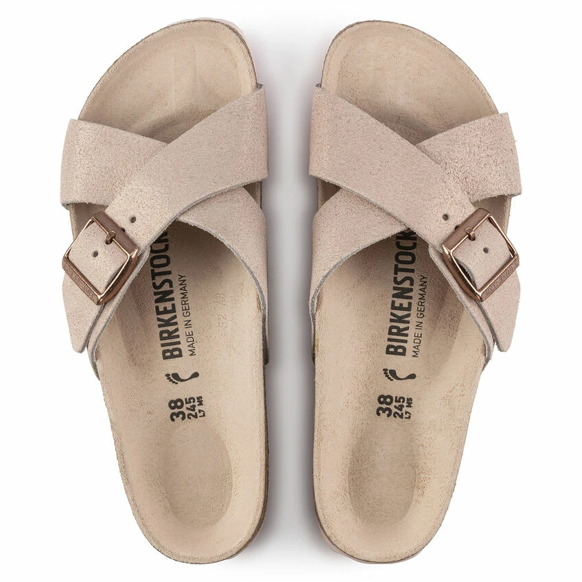 The BIRKENSTOCK Siena is a classic sandal, featuring crossed straps and a subtle shimmer finish. The upper is made from incredibly soft suede for added comfort.