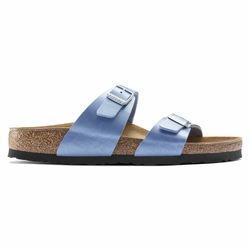 The BIRKENSTOCK Sydney has both form and function. With its two simple straps, it covers fashion and comfort. This version features silver-toned buckles and silky sheen finish. The upper is made from the skin-friendly, hard-wearing synthetic material Birko-Flor® with a silky sheen.