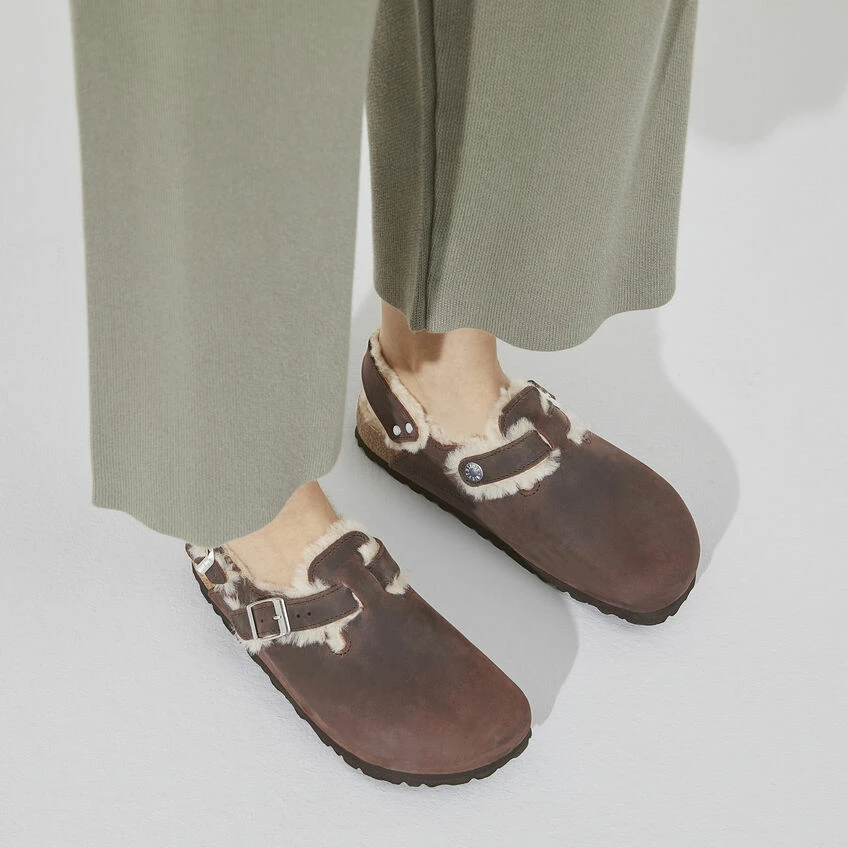The BIRKENSTOCK Tokio clog is a variation of the classic Boston. This version features a back strap and shearling lining for added coziness. The upper is a soft yet durable oiled leather.
